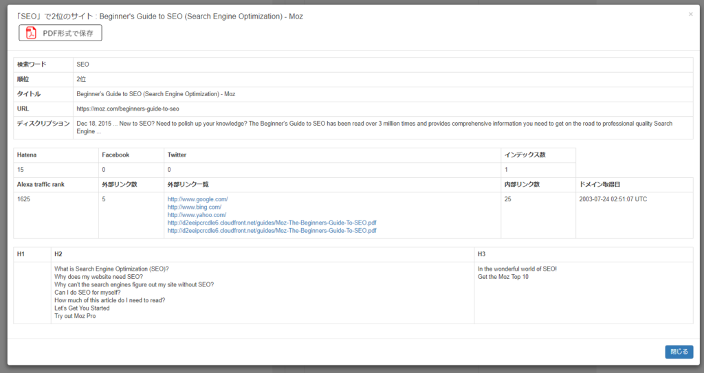 それに加えて、調査した結果全体や、詳細表示画面だけをPDFで出力することもボタンクリック1回でできるようになっています。