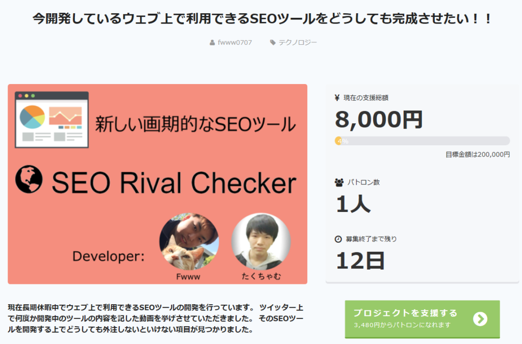 今回は資金調達のために、クラウドファンディングサイトであるcamp-fire.jpにプロジェクトを掲載させていただきました。