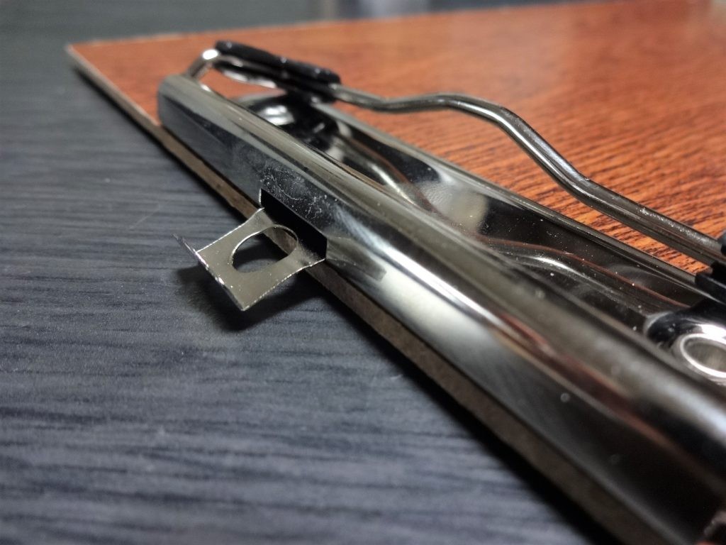 かなり荒業ですが、上の画像のようにひっかける部分を出しててこの原理で曲げ、その後に少し力を入れて仕舞うと出てこなくなります。