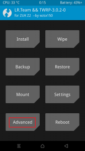 4. おなじみのTWRPトップページから、Advancedと書いてあるボタンを押して次のステップに進みます。
