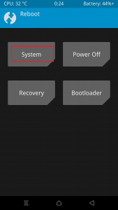 13. TWRPのTOPページに戻り、Rebootボタンを押してからSystemをリブートさせてください。