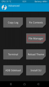 6. Advanced設定に入ったら、TWRPのファイルマネージャ機能を使用するためにFile Managerボタンを押します。